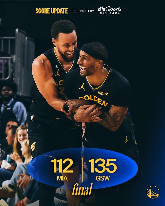 丰泰基奥、威金斯持续三分球不中,波杰姆斯基里突外投连得8分,勇士轰出了15比0的攻势,将分差扩大至24分。距离终场还剩3分54秒,斯波尔斯特拉再次请求暂停并换上板凳席末端的球员,热火选择提前弃子认负,比赛就此失去了悬念。两队在场上练兵,时间逐渐走完。最终,勇士以135比112完胜热火,得以豪取4连胜。
