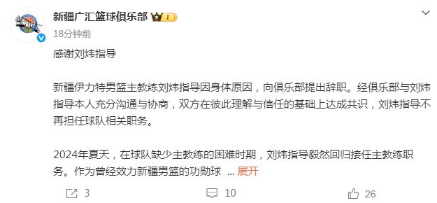 新疆伊力特男篮主教练刘炜指导因身体原因,向俱乐部提出辞职。经俱乐部与刘炜指导本人充分沟通与协商,双方在彼此理解与信任的基础上达成共识,刘炜指导不再担任球队相关职务。