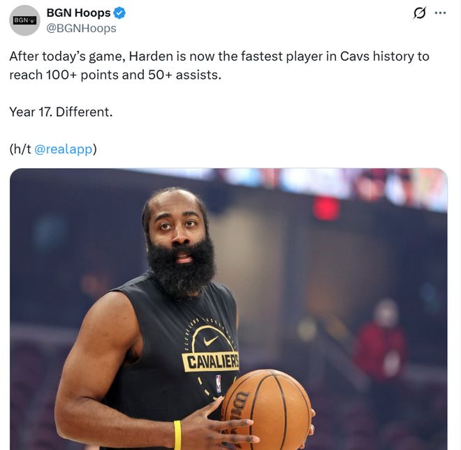 凭借这样的表现,哈登加盟骑士队短短6场比赛,已经拿到至少100分50助,创造队史最快纪录,也带队拿下5胜1负傲人战绩。