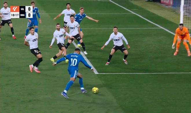 第65分钟,卡雷拉斯边路一个人突入禁区,连续过掉4人,轻松推射得手,0:1!皇马终于打破僵局。瓦伦西亚随即做出换人调整,加强攻势。而皇马换上了伤愈复出的阿诺德,加强后场的防守。补时阶段,急于进攻的瓦伦西亚后场出现巨大的空档,卜拉欣迪亚斯横传,中路无人防守的姆巴佩门前推射破门,皇马锁定胜局。
