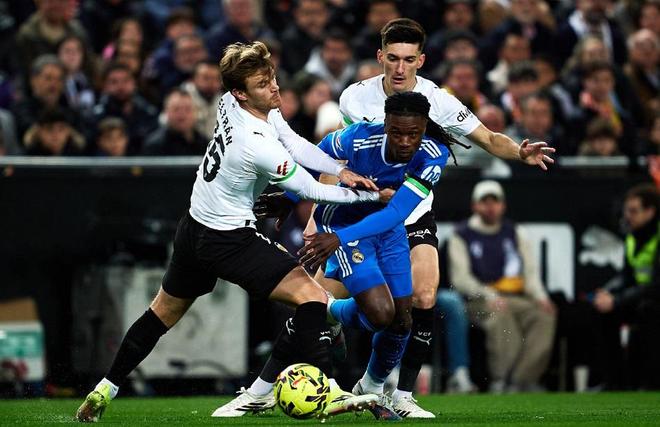 西甲联赛第23轮,皇家马德里客场挑战瓦伦西亚。两队无论是实力还是排名,都有不小的差距。但是近期皇马的整体形势并不好,前场四大攻击手,只剩下了姆巴佩一个人,维尼修斯停赛,罗德里戈和贝林厄姆因伤缺阵,这也给了瓦伦西亚取分的希望。