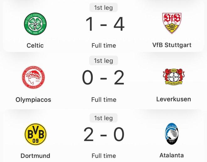 本周结束的欧战淘汰赛附加赛首回合,多特蒙德欧冠主场2-0击败亚特兰大,勒沃库森欧冠客场2-0战胜奥林匹亚科斯,斯图加特欧联杯客场4-1完胜凯尔特人,德甲三队全部赢球,晋级形势大好。